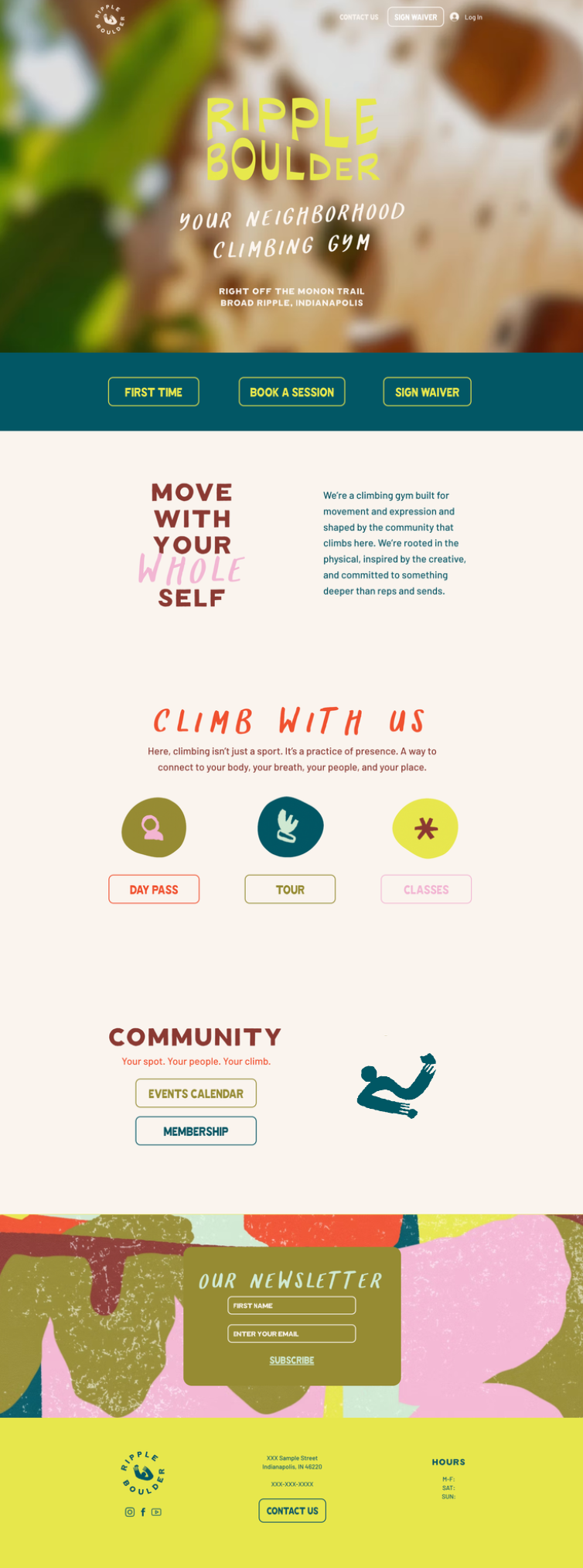 ← OUR WORK PROJECT NAME Ripple Boulder DELIVERABLES Branding, web design INDUSTRY Climbing gym A vibrant brand, energized by a bold and artistic soul, designed to gather and support a colorful local community and bring a fresh flavor to a niche interest. ← OUR WORK